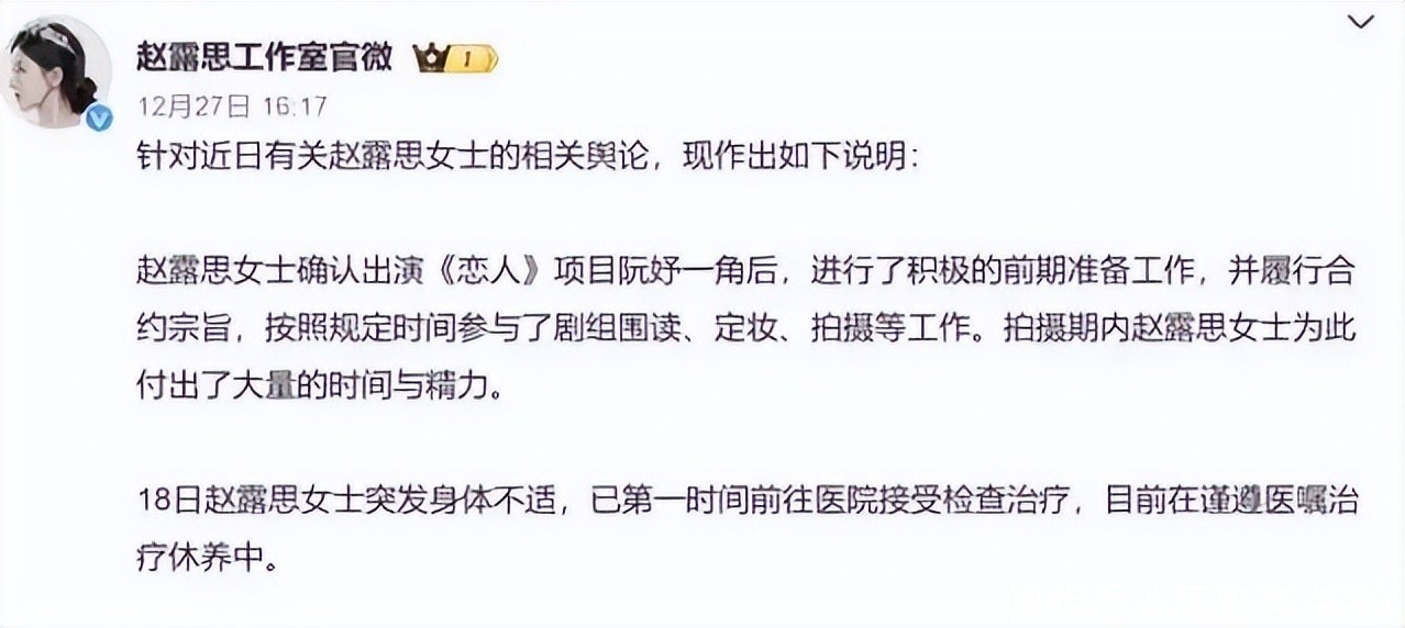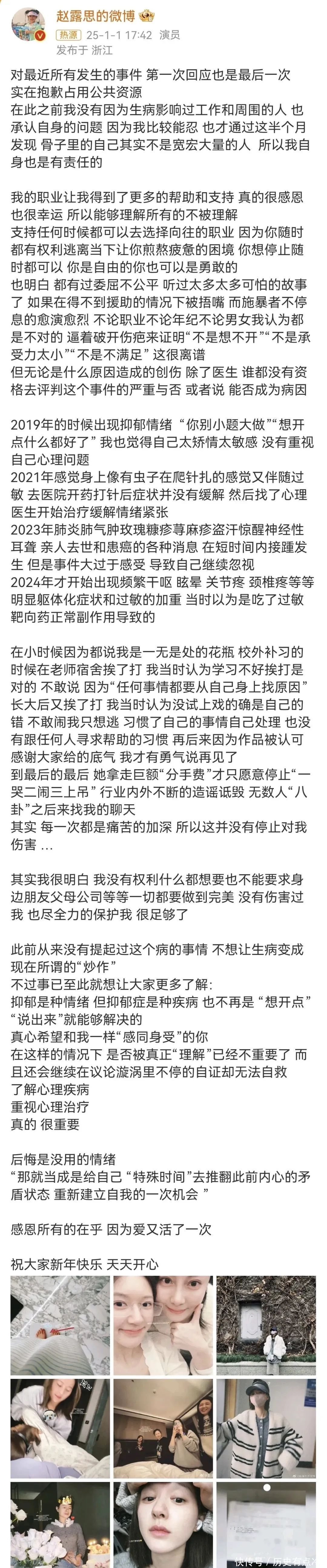 1月1日,赵露念念发文回报了病情,称我方得了“失语症”。这个病情是因为恒久的抑郁情谊导致出现说话驱逐的情况。