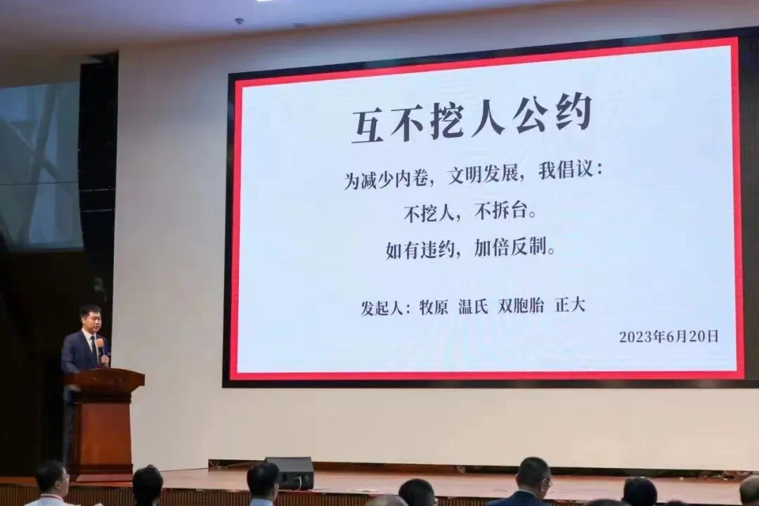 6月20日,在牧原集团举办的第十八届养猪节共创分享论坛上,牧原荟萃营合温氏、双胞胎、廉明向四大养猪企业向行业发出倡议,尊重行业规律,打造买卖好意思丽,并签署“互不挖东说念主协议”。协议具体骨子为:为减少内卷,好意思丽发展,我倡议:不挖东说念主,不拆台。如有误期,加倍反制。